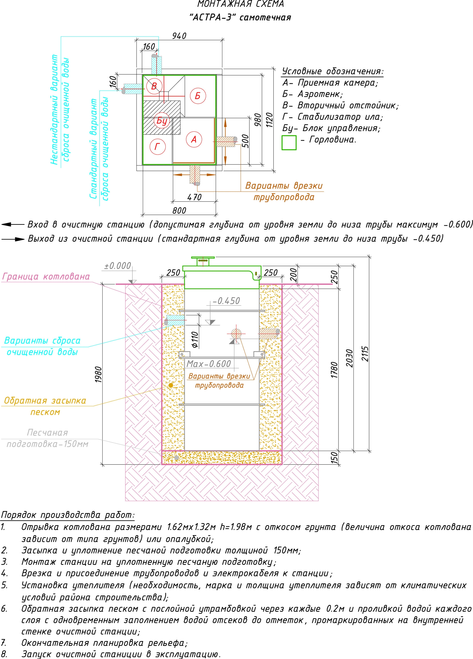 Астра 3 по отношению к объекту канализования должна быть смонтирована так, чтобы подводящая трасса трубопровода была максимально прямой, в противном случае требуется устройство поворотных колодцев.